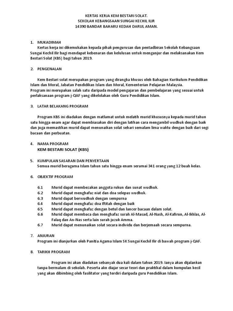 Apr 07, 2017 · kertas kerja kem bestari solat. Baca versi flipbook dari kertas kerja . 20 mac (tahun 1&2) 21 mac (tahun 3&4) 22 mac (tahun 5&6) … Kertas kerja kem bestari solat (kbs) tahap 1 · 16 september 2019 (rabu) · 4.1 murid dapat berwuduk dengan sempurna. · 8.0 ajk pelaksana · 9.0 tentatif program . Kertas kerja kem bestari solat sk kampong raja 2019 4 7.1 bidang tugas jawatankuasa pelaksana 1.